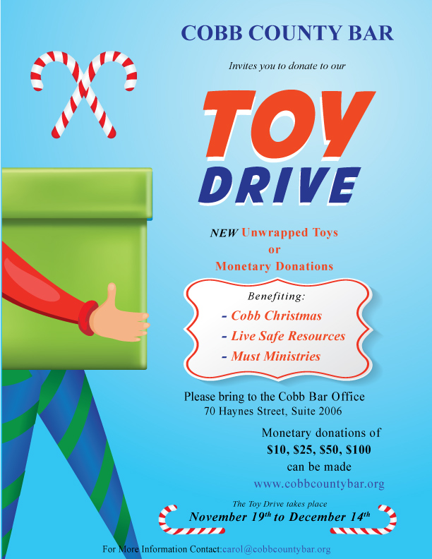 Cobb County Bar Association Holiday Toy Drive Benefiting Cobb Christmas, Live Safe Resources and Must Ministries.Please bring a New Unwrapped Toy to the Cobb Bar office or to our Sleighbells on the Square 5K Race